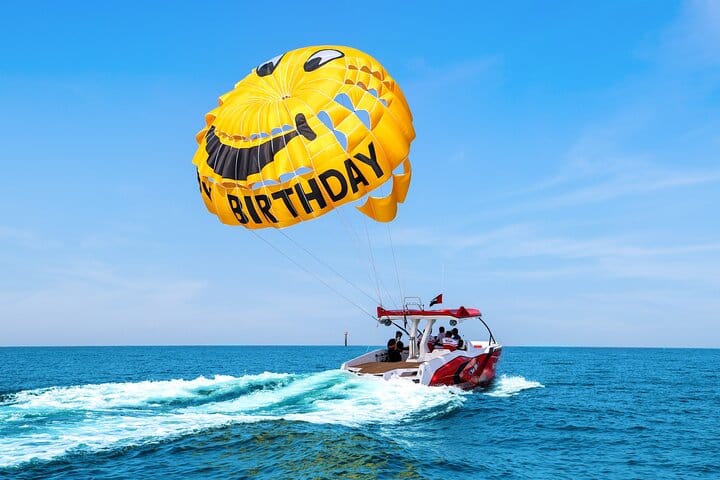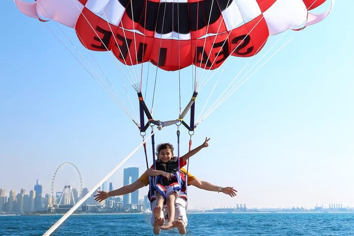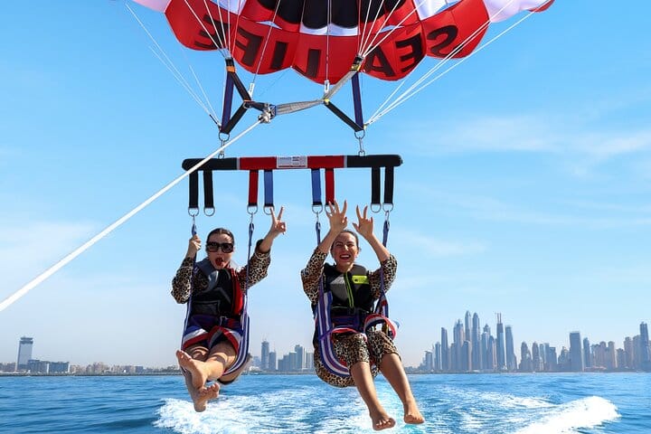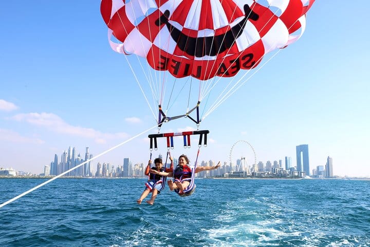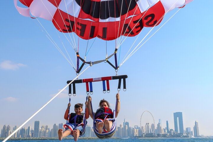 Experience Dubai's top coastal sights from above in the guided parasailing excursion. Get assistance from our experts as you strap into a parachute and soar above the Dubai Harbour. So, enhance the thrill and get an unforgettable cityscape by flying above 250 meters from the water level with parasailing. Get unforgettable memories for your Instagram and experience the best parasailing experience with us.