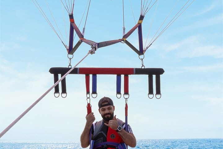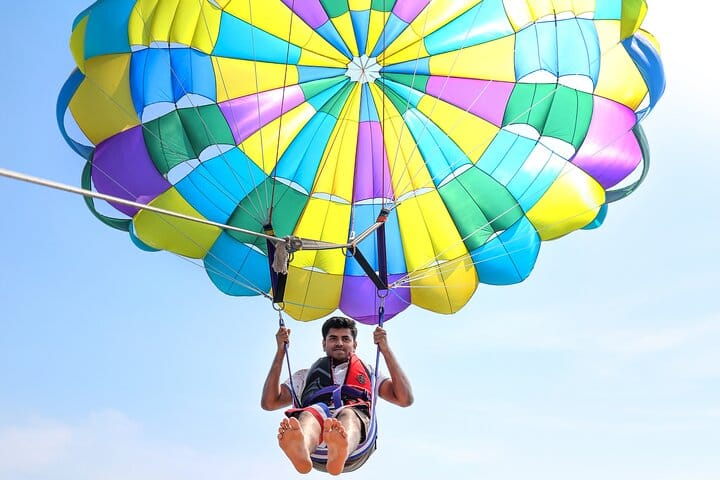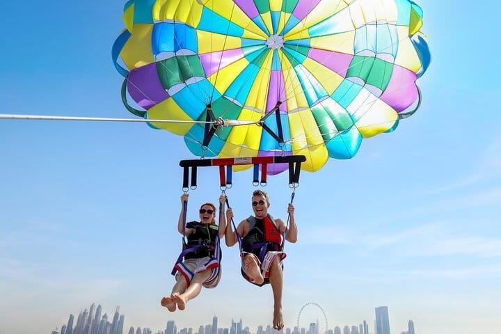 Experience the exhilaration of parasailing on the pristine beaches of Dubai, soaring high above the azure waters for an unforgettable adventure in the sky.