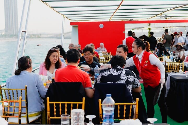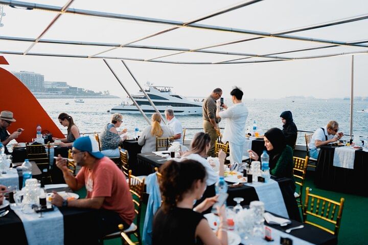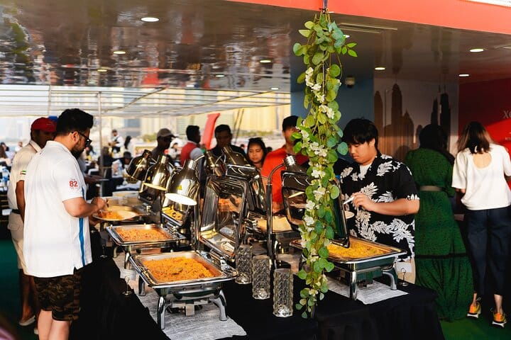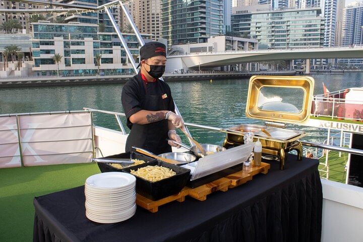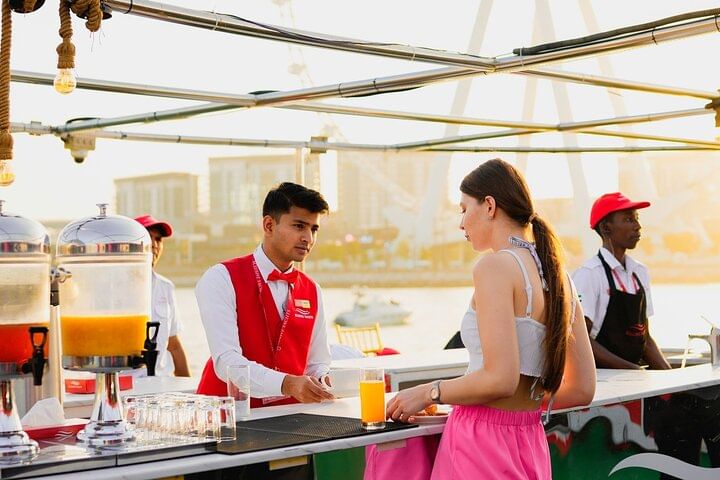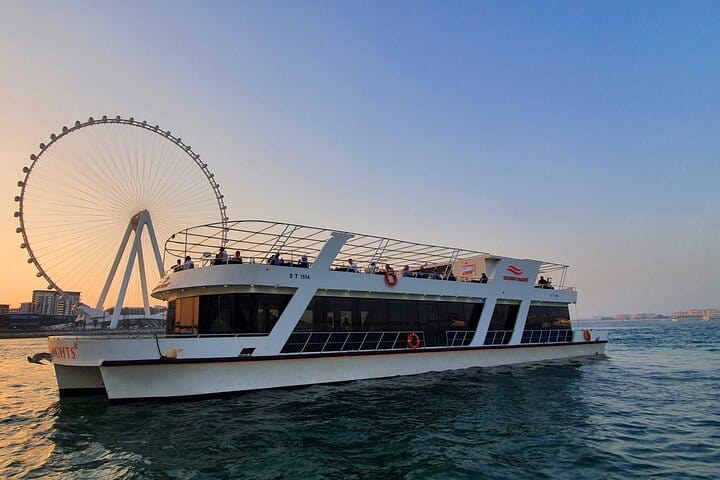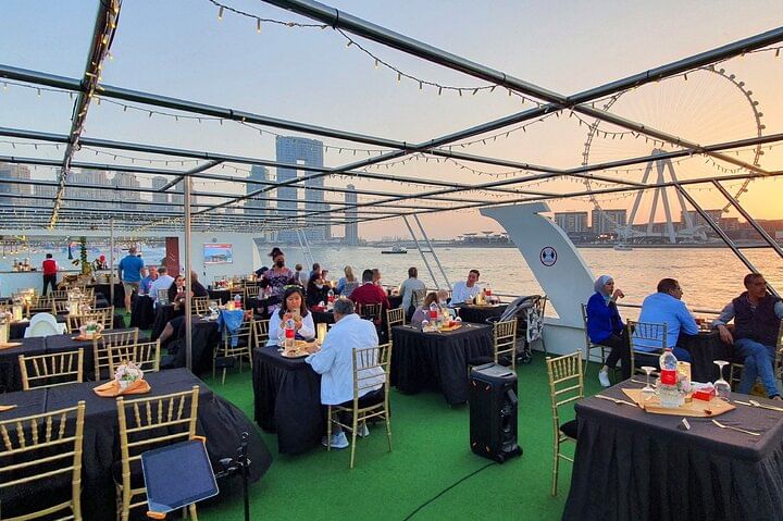 Experience the epitome of luxury and enchantment with a sunset or dinner cruise in Dubai, where every moment is a celebration of elegance and splendor. As you embark on this journey, marvel at the panoramic views of Dubai Marina's glittering skyline, the majestic Ain Dubai observation wheel, the vibrant Jumeirah Beach Residence (JBR), and the bustling Dubai Harbour. Admire the architectural wonders lining the waterfront, illuminated by the warm hues of the setting sun, creating a magical ambiance. Indulge in a sumptuous international buffet featuring a tantalizing array of culinary delights, meticulously prepared to tantalize your taste buds. From delectable pastas to exotic dishes from around the world, every bite is a culinary adventure. As you savor the flavors and sip on refreshing beverages, bask in the opulence of your surroundings and create unforgettable memories against the backdrop of Dubai's iconic landmarks, making this cruise an experience of a lifetime.
